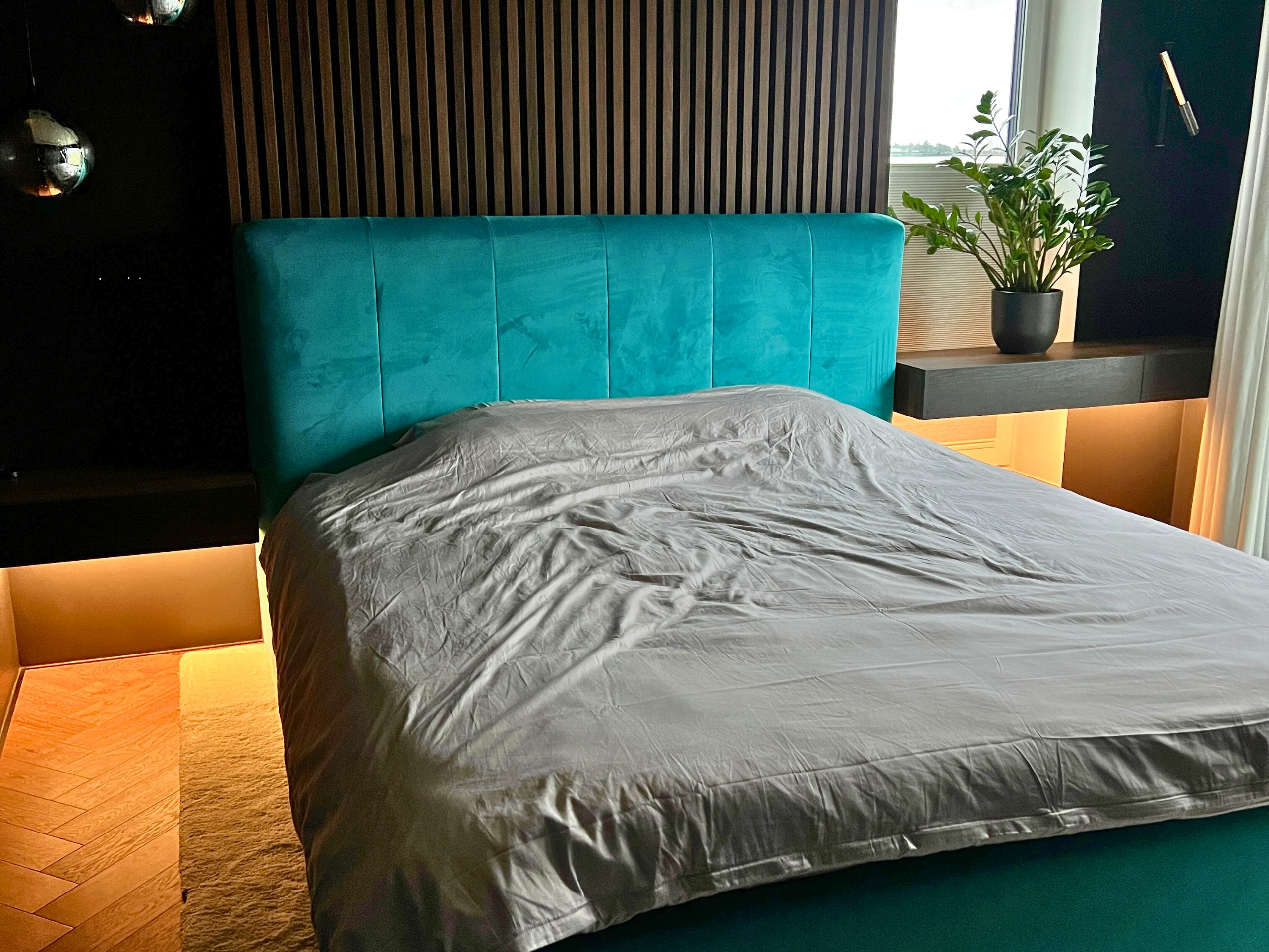 Eritellimusena tehtud pesukastiga voodi 180 × 200 cm. Sleepy mudeli kõrgem peats + Fancy voodi raam, kangas Ton Turquise 612