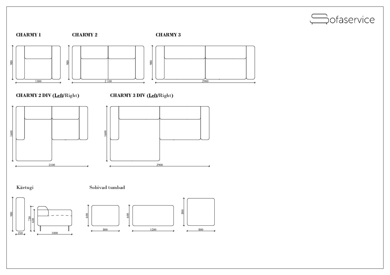 Unistuste Charmy ei pea piirduma standardmõõtudega. Kui süda ihkab laiemat käetuge või sügavamat isteosa, anna julgelt märku. Kõik – peale seljatoe konstruktsiooni – on muudetav.