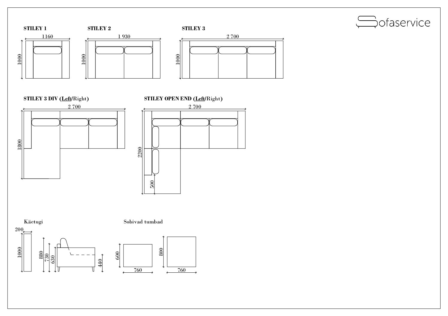 Kõige paremini sobivad Stileyle 12–15 cm kõrgused jalad, mis annavad diivanile mõnusa ilme ja mugava istumiskõguse.